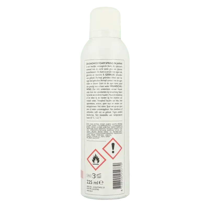 DA Showerfoam Spring in Japan is een heerlijke verzorgende foam, die zijdezacht aanvoelt met de zacht zoete geur van Japanse kersenbloesem. De foam is verrijkt met argan olie, glycerine en vitamine B.