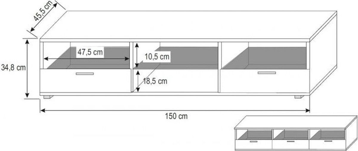 Tv-kast ROMA is een ruime, functionele kast die plaats biedt aan accessoires voor thuisbioscopen en een geweldige decoratie van de woonkamer zal zijn. Met drie lades en planken kun je veel kleine spullen ordenen.